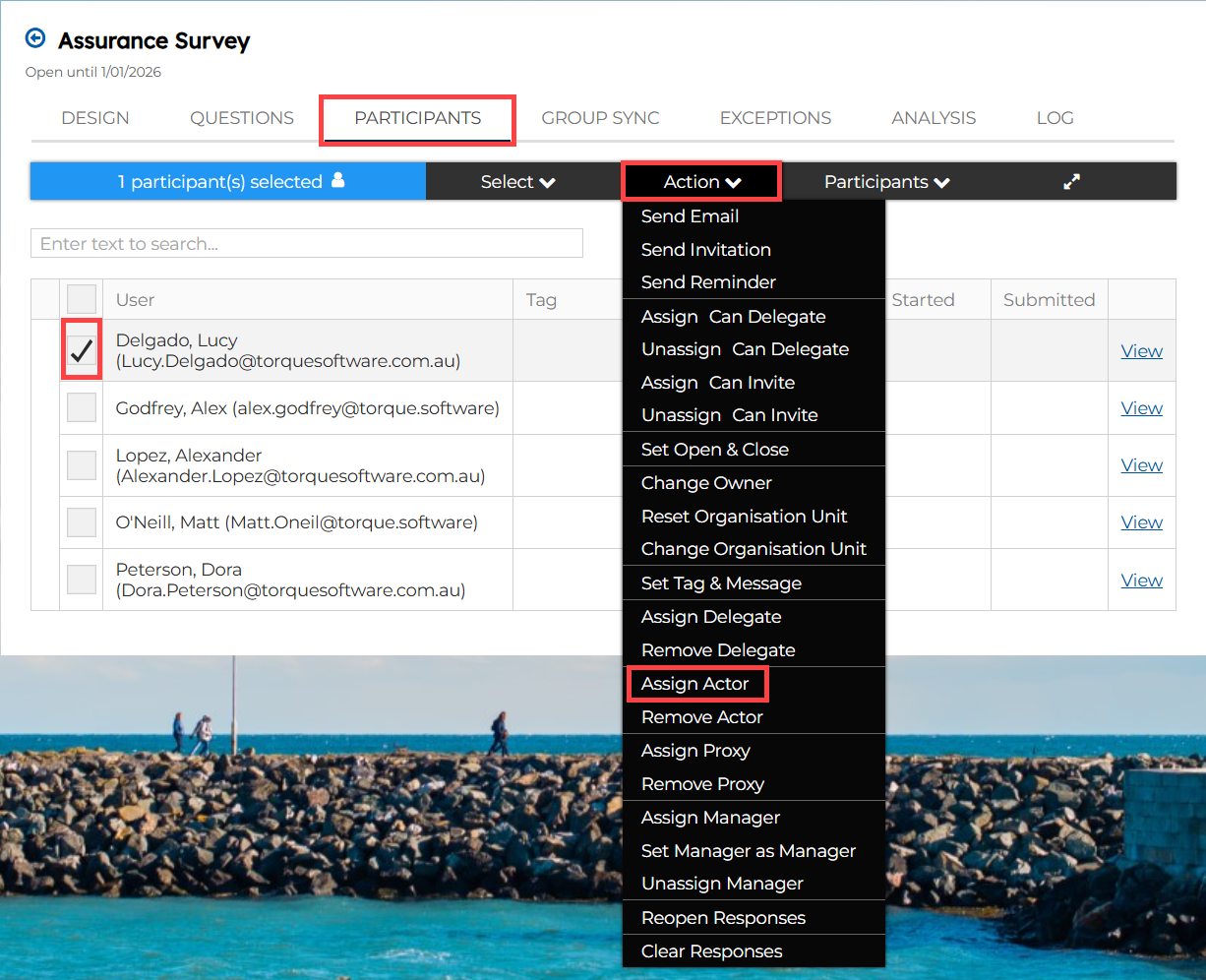 8. Select ‘Assign Actor’. * Please note you can only assign Actor to an open survey.