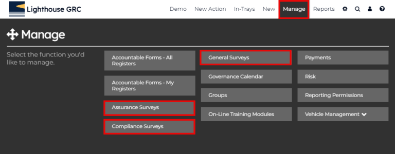 3. Then locate the required survey group from the menu i.e. ‘General Surveys’, ‘Assurance Surveys’ or ‘Compliance Surveys’.