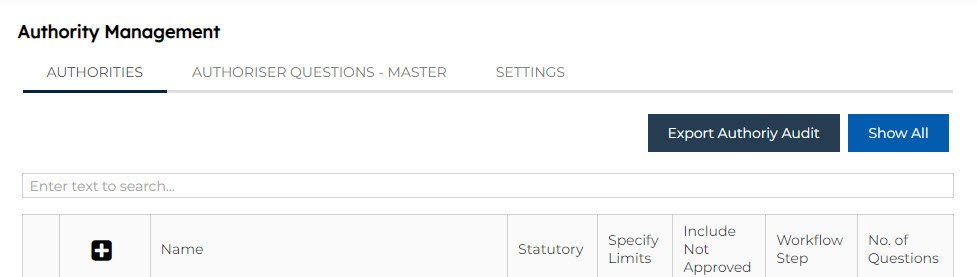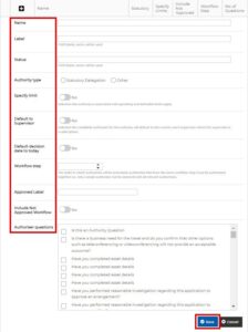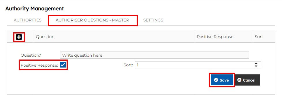 - Authoriser Questions = The questions the authoriser must answer when exercising their authority (if required). This is selected from the Authority Question Master list – refer to the next section to learn how to create authority questions.