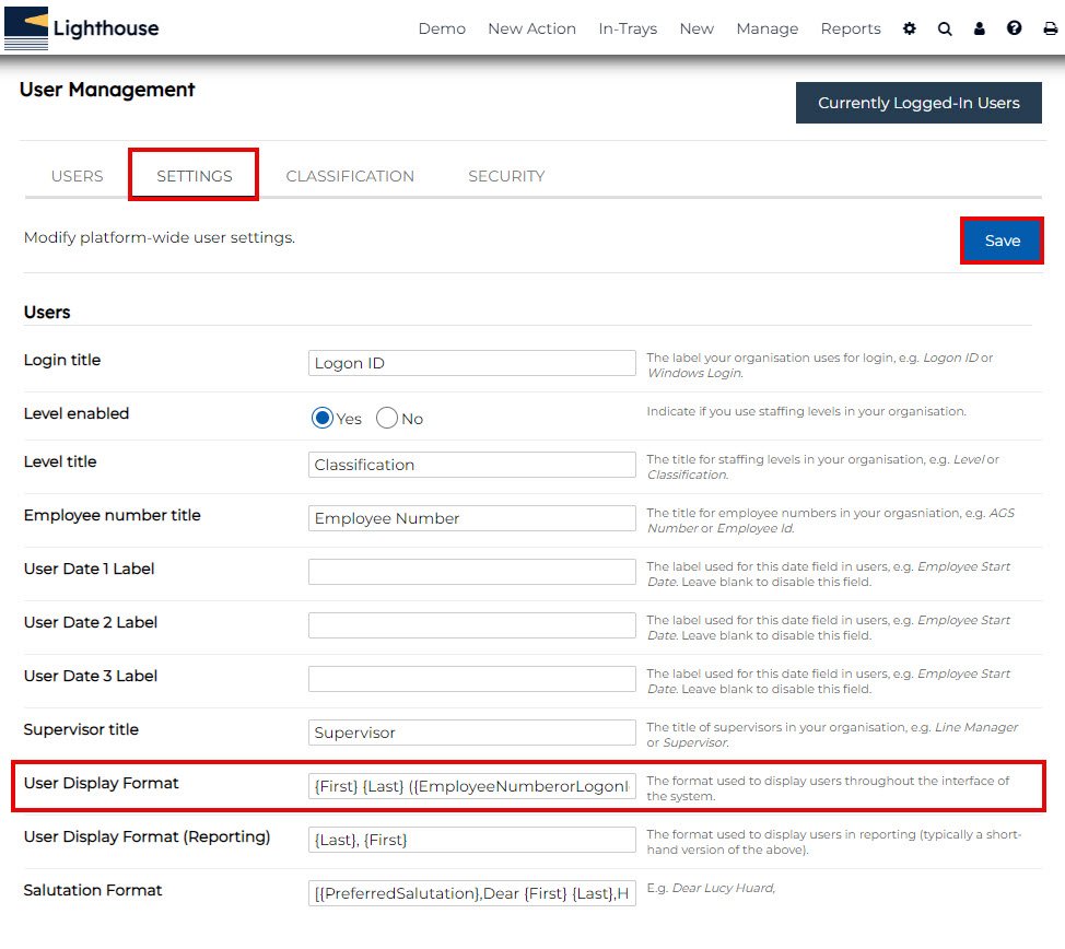 This article provides instructions on how to customise the ‘User Display Format’ in Lighthouse.