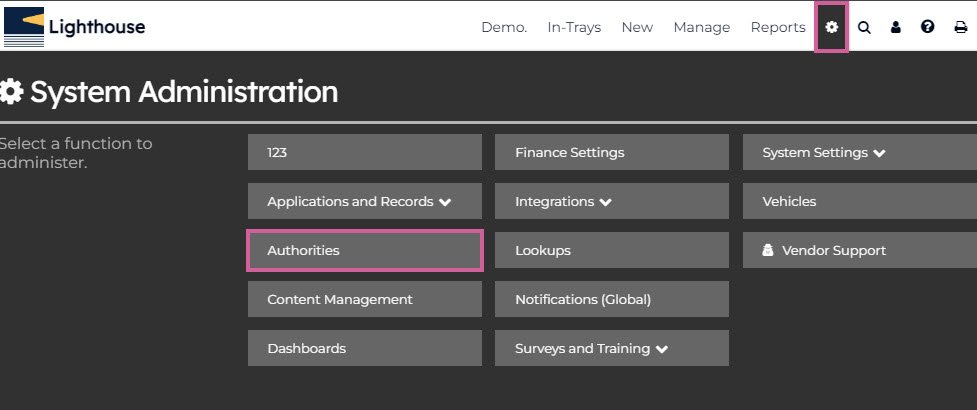 Step 1: Access Authority section from Administration area in Lighthouse.