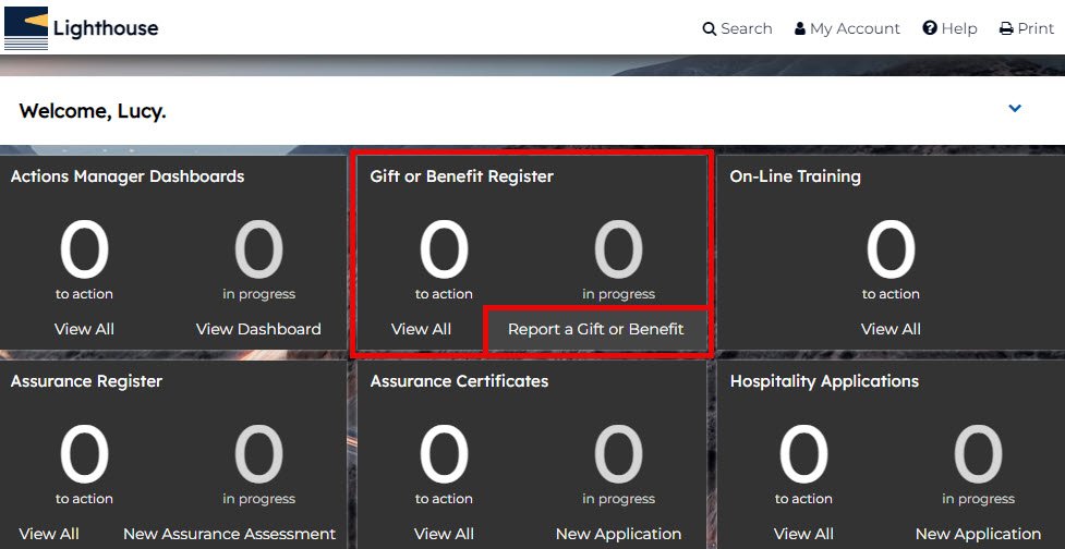 1. Log into your Lighthouse instance and on the Dashboard, locate Gifts and Benefit Register.