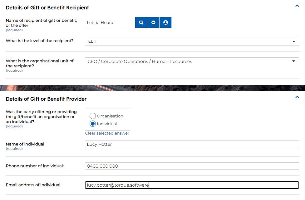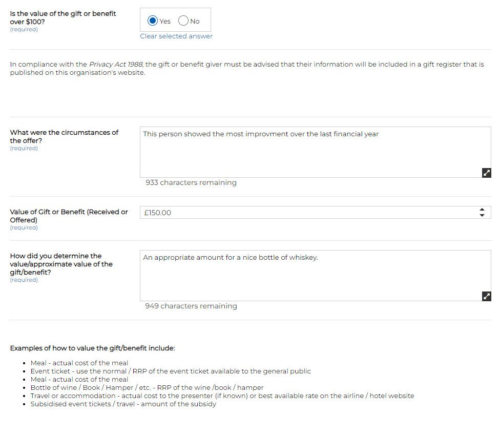 3. Fill out the information below detailing who the gift/benefit is for, their level and organisational level.