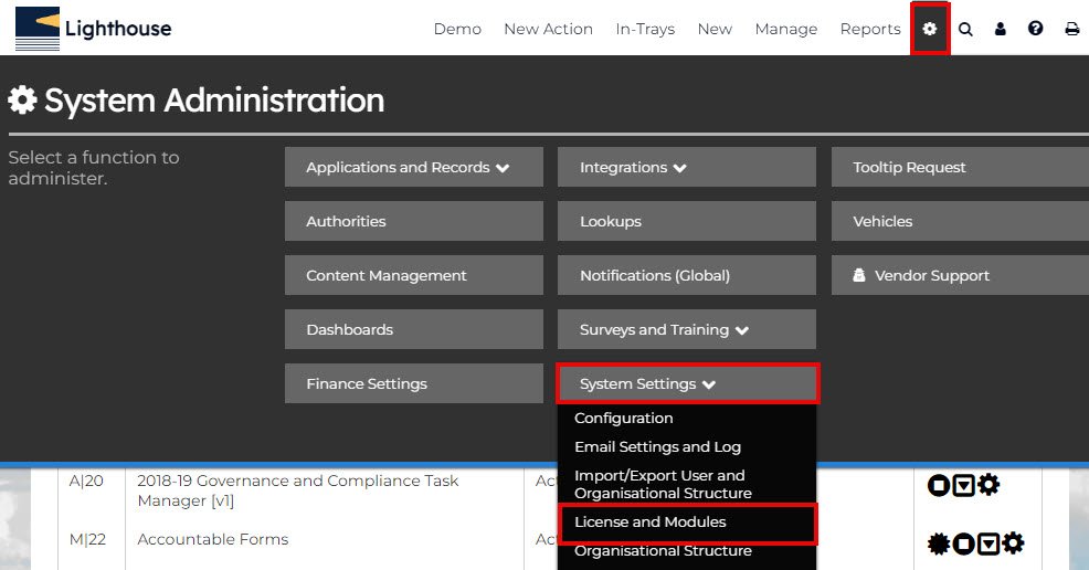 12. Go back into your live instance by selecting the ‘System Administration’, ‘System Settings’ and selecting ‘License and Modules’.