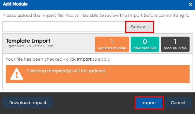 • After exporting, click on the ‘Add Module’ button and select ‘Import File’ to import into your live instance.