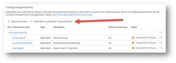 - When back on the Configured Permissions view, click ‘Grant admin consent for Torque Software’.