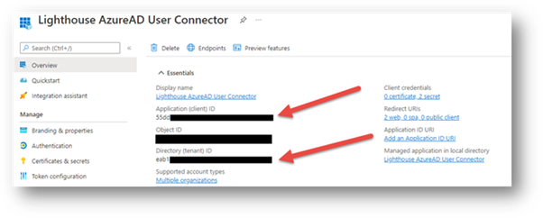 From the “Lighthouse Entra ID User Connector” app registration overview page in Entra ID (created in the first section of this document), copy and paste the relevant values into the fields in Lighthouse: