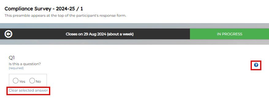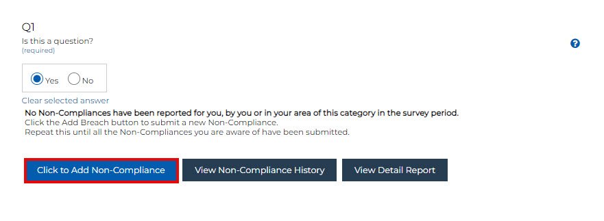 Your survey may contain Non-Compliance questions. Non-Compliance questions help capture Non-Compliances not previously reported over the course of a given period. The questions prompt users to consider if their actions have been in accordance with the agency’s legislative and policy framework.