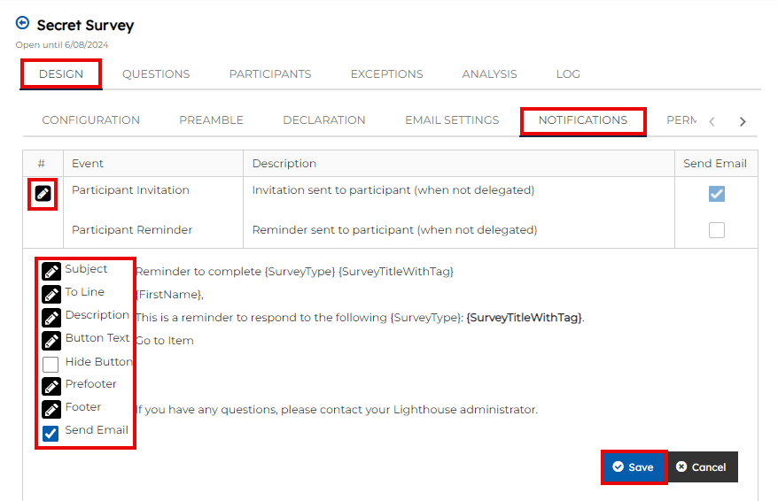 1. Once you’re inside the survey ‘Design‘ tab, click on the ‘Notifications‘ tab.