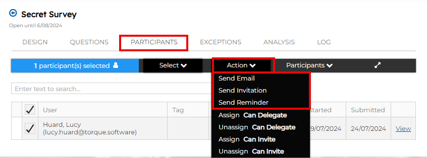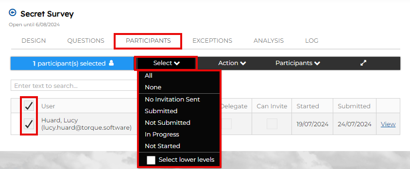 - Option 1 – Under the ‘Select‘ menu, you can select users by the status of their survey response (e.g. ‘Not Submitted’, ‘All’, ‘Not Started’).